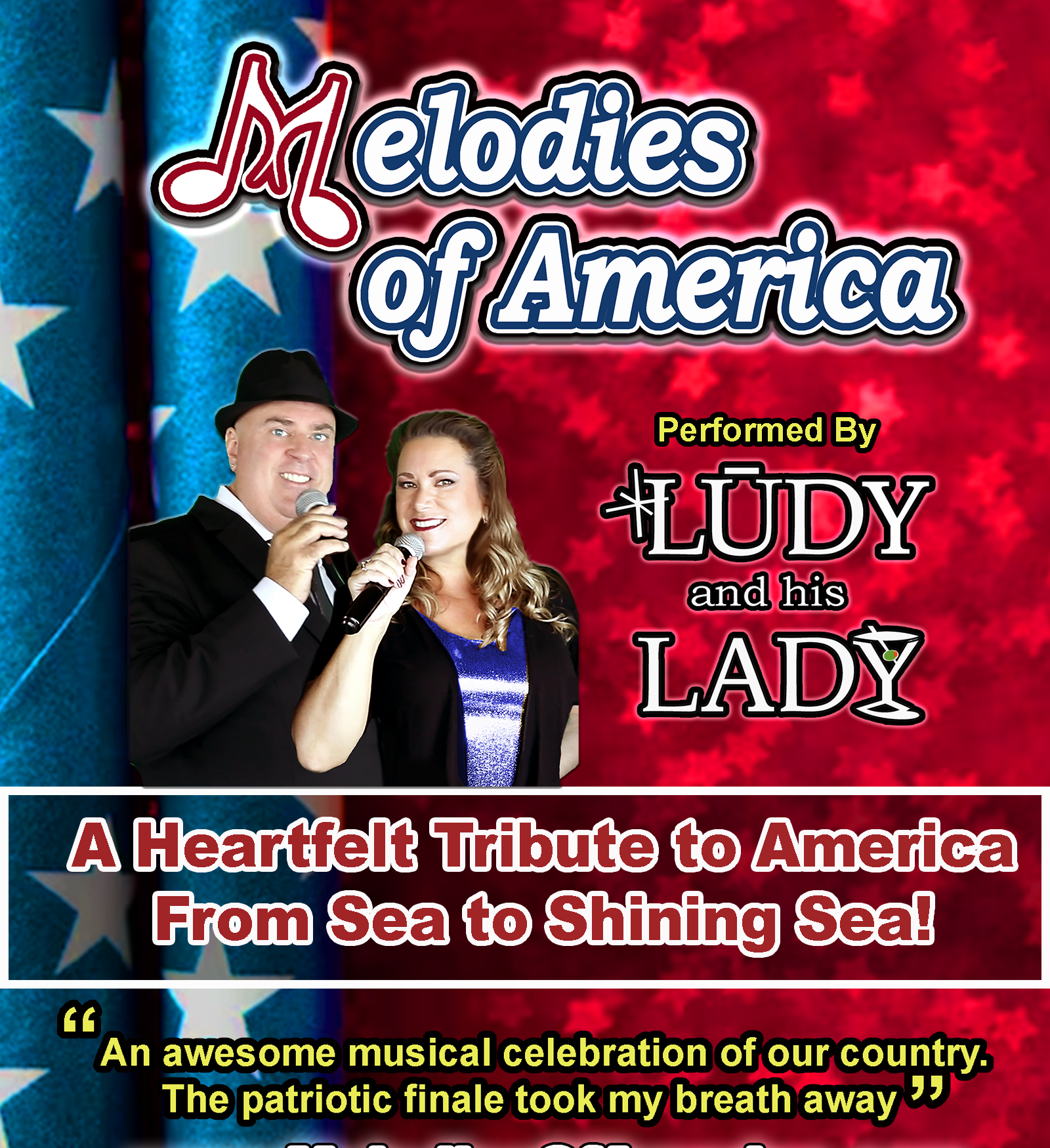 Back to All Events Private Event- Melodies of America - Rosemont, IL Monday, June 15, 2026 11:00 AM 1:30 PM Google Calendar ICS Melodies of America Tribute Show LUDY and his LADY Nicole present this special Patriotic Tribute show exclusively to the member of the Wintrust Platinum Adventures Club in Rosemont, IL. Providing world class entertainment to special member only events.